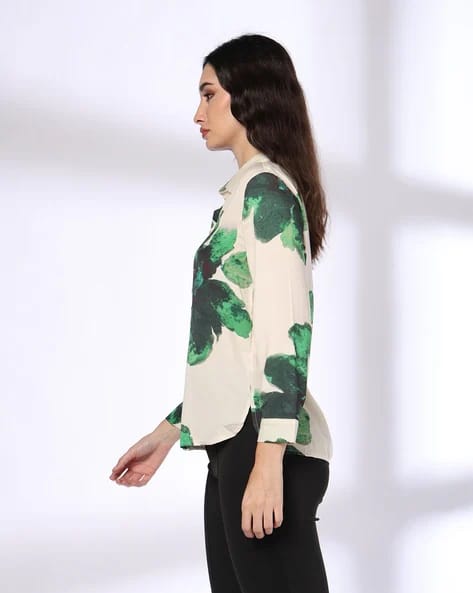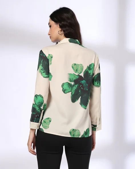 The top in the image is a beige button-up shirt featuring bold green abstract floral prints. It has a classic collar and long sleeves, offering a versatile and elegant look. It’s paired with black pants, which create a sophisticated contrast and make the outfit stand out. The lightweight fabric and unique design make this top ideal for both casual and semi-formal settings.