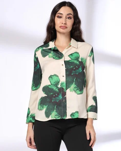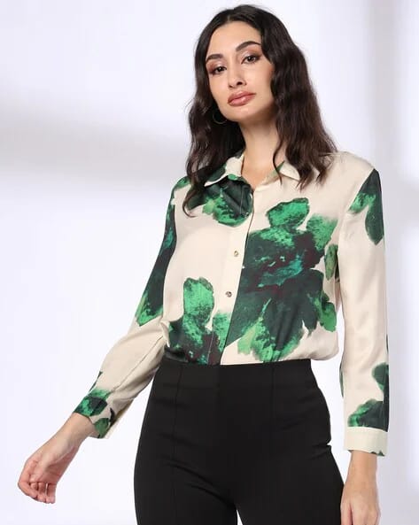 The top in the image is a beige button-up shirt featuring bold green abstract floral prints.